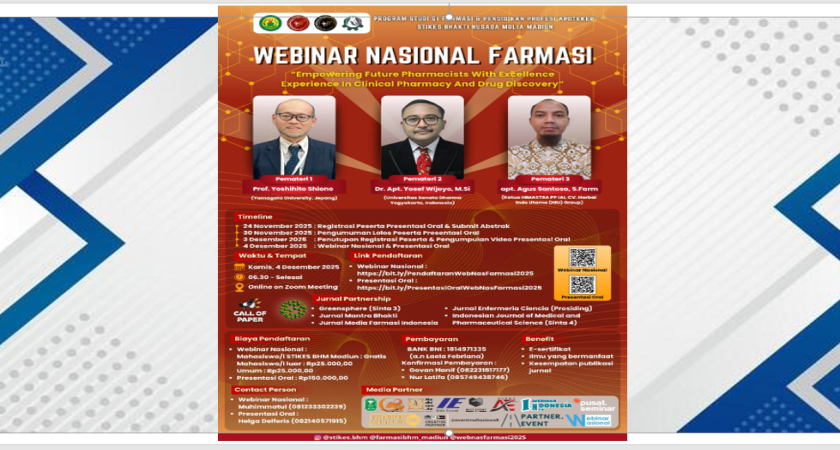Webinar nasional ini menghadirkan narasumber berkompeten dari dalam dan luar negeri, siap memberikan wawasan baru tentang pengembangan kefarmasian, penemuan obat, hingga praktik farmasi klinik modern.