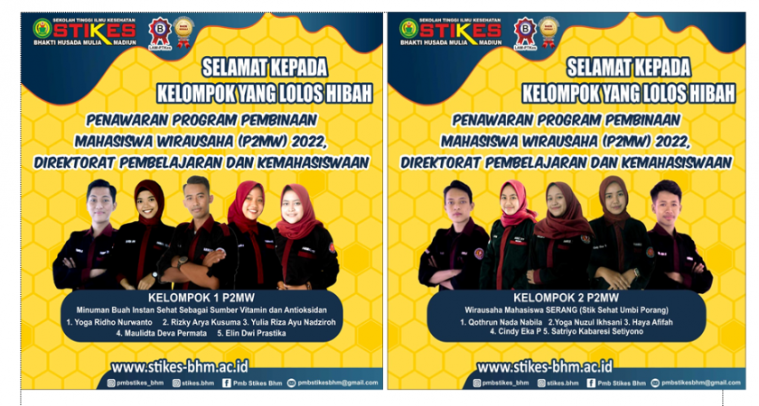 Mahasiswa Stikes Bhakti Husada Mulia Madiun berhasil lolos dan mendapatkan hibah pada ajang Penawaran Program Pembinaan Mahasiswa Wirausaha (P2MW) Tahun 2022 yang ditawarkan oleh Direktorat Pembelajaran dan Kemahasiswaan (Belmawa).